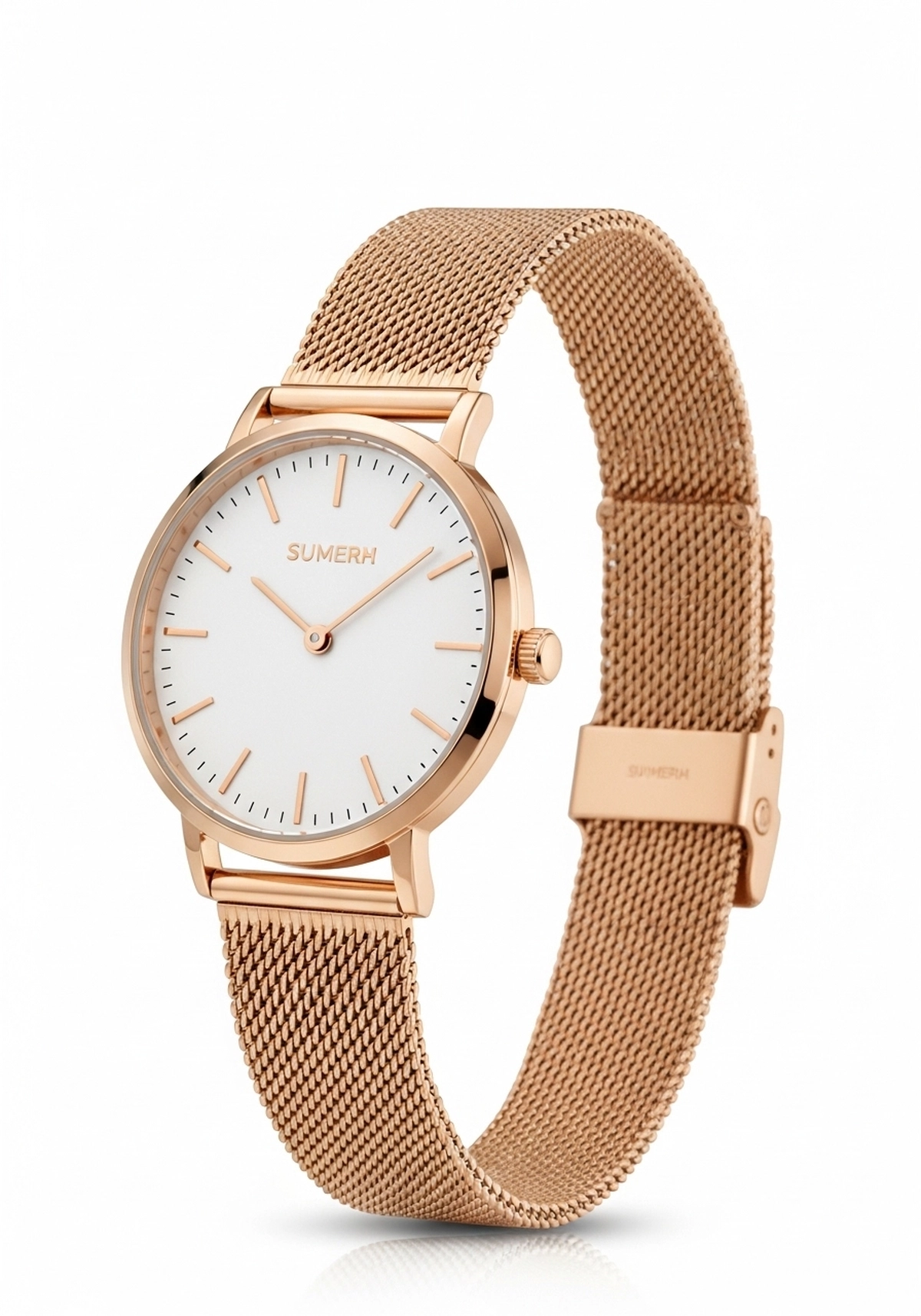Com caixa fina em acabamento rosé e mostrador minimalista branco, ele combina perfeitamente com produções formais ou looks modernos. A pulseira em malha metálica proporciona ajuste confortável e visual refinado.
